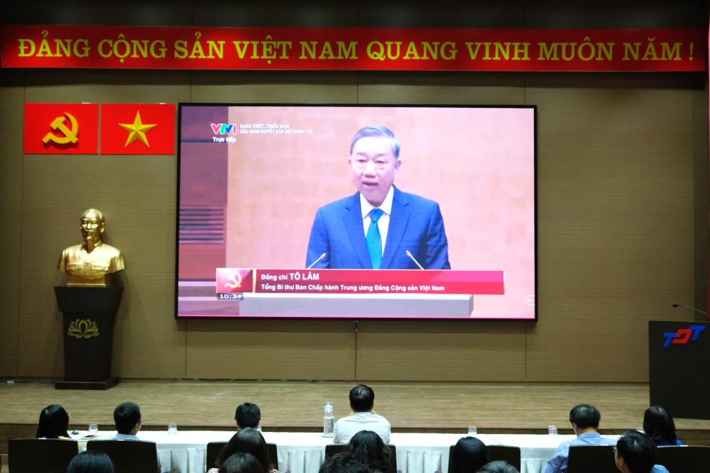 Tại điểm cầu TDTU, tham dự có các đồng chí là Ủy viên Ban chấp hành Đảng bộ Trường; Bí thư/Chi ủy, đảng viên các chi bộ trực thuộc; Ủy viên Ban Chấp hành Công đoàn Trường, Ủy viên Ban Chấp hành Đoàn Thanh niên Trường, Lãnh đạo các đơn vị thuộc/trực thuộc Trường dưới sự chủ trì của đồng chí Vũ Anh Đức, Bí Thư Đảng ủy, Chủ tịch Hội đồng trường.