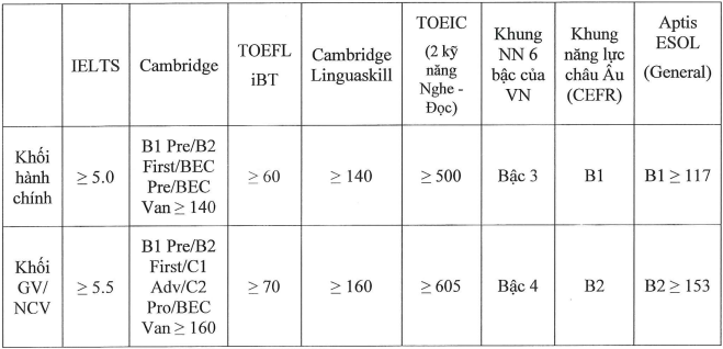 Bảng quy đổi tương đương trình độ tiếng Anh: