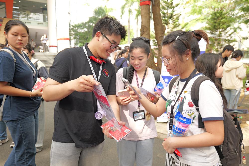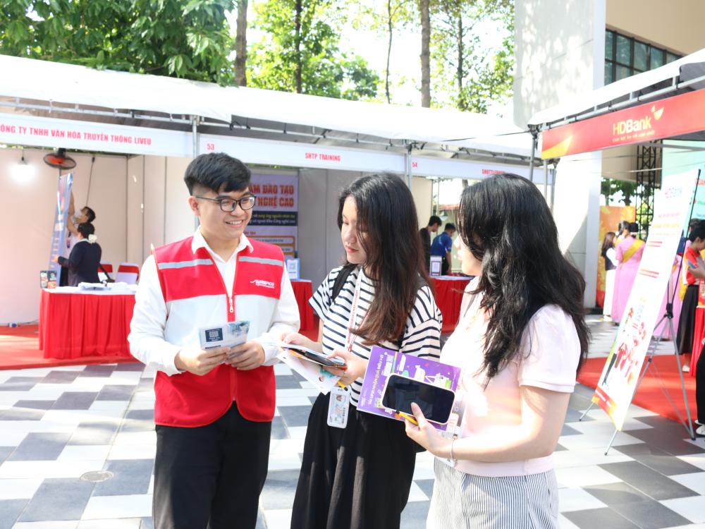 Đông đảo sinh viên tham quan các gian hàng tuyển dụng để tìm hiểu cơ hội thực tập và việc làm
