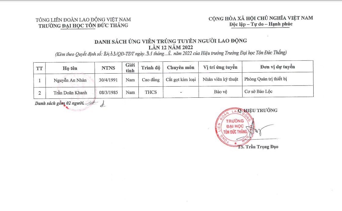 Hội đồng tuyển dụng Trường Đại học Tôn Đức Thắng thông báo về việc công nhận kết quả tuyển dụng năm 2022 như sau: